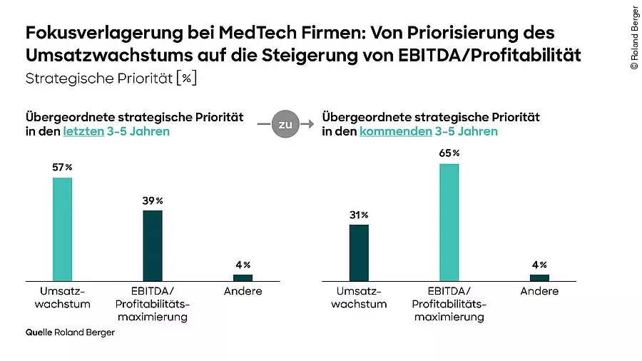 „Bisher war die Medizintechnikbranche insbesondere durch Wachstumsstrategien, wie beispielsweise die Einführung neuer Produkte und/oder den Einstieg in weitere Märkte, geprägt – und dies bei historisch hohen Margen im Industrievergleich“, sagt Peter Magunia, Partner von Roland Berger. Allerdings sei die Rentabilität in den vergangenen Jahren deutlich gesunken, wie die letztjährige MedTech-Studie gezeigt habe. Die Ursache dafür sei das schwierige makroökonomische Umfeld mit Inflation, steigenden Zinsen und Unsicherheiten durch geopolitische Spannungen gewesen. Die aktuelle Studie zeige nun, dass die Unternehmen darauf reagieren, ihre Strategie umstellen und verstärkt die Steigerung der Rentabilität in den Fokus nehmen.